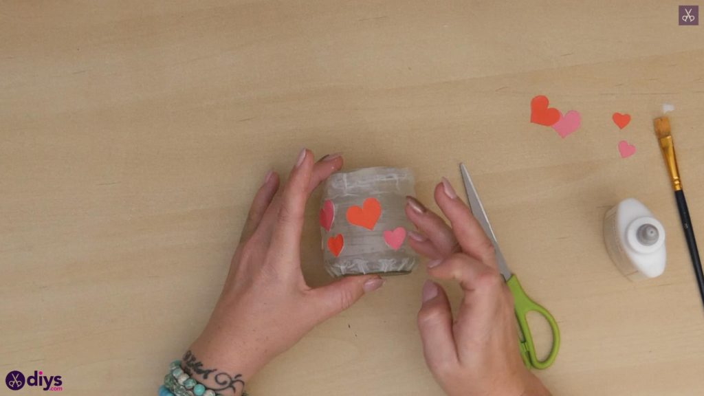 Stick your red and pink hearts down all over the surface of the jar on top of the vellum paper, scattering them and alternating the colours however you please! Stick each one down by applying a dot of white flue on the back and sticking it right to the vellum paper that now coats your jar. Stick them all over the jar but not on the upper dip around where the lid would have once screwed on; you’ll make a different effect there. Glue down all of your hearts except two; one pink and one red.